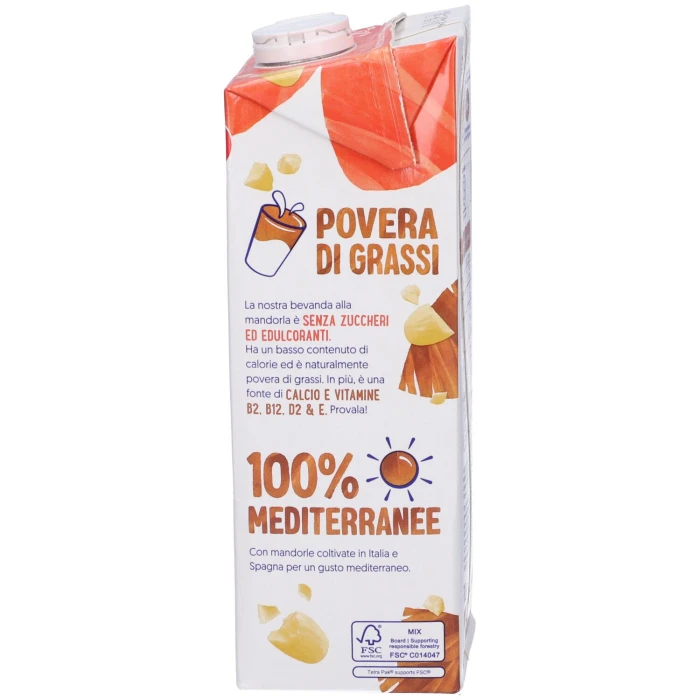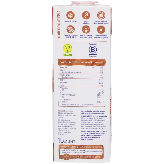 Acqua, MANDORLA (Spagna, Italia)(2,3%), calcio (fosfato tricalcio), sale marino, stabilizzanti (farina di semi di carrube, gomma di gellano), emulsionante (lecitine), aroma naturale, vitamine B2, B12, E, D2. PUO' CONTENERE TRACCE DI FRUTTA A GUSCIO (NO ARACHIDI). SENZA LATTE, DERIVATI DEL LATTE E GLUTINE. NATURALMENTE SENZA LATTOSIO
