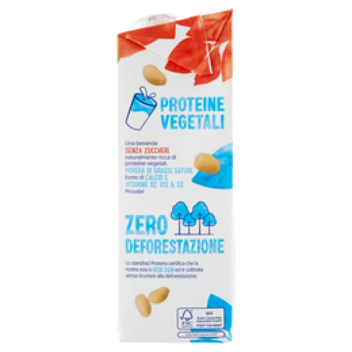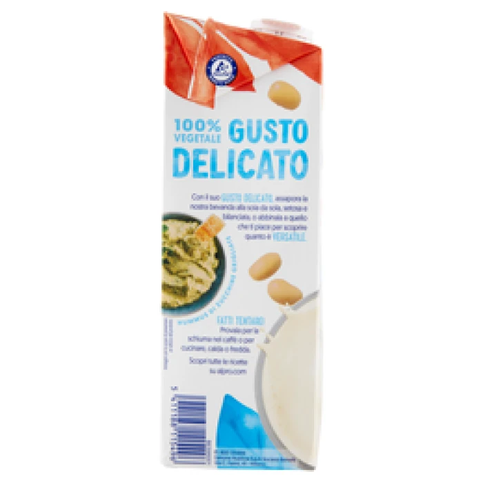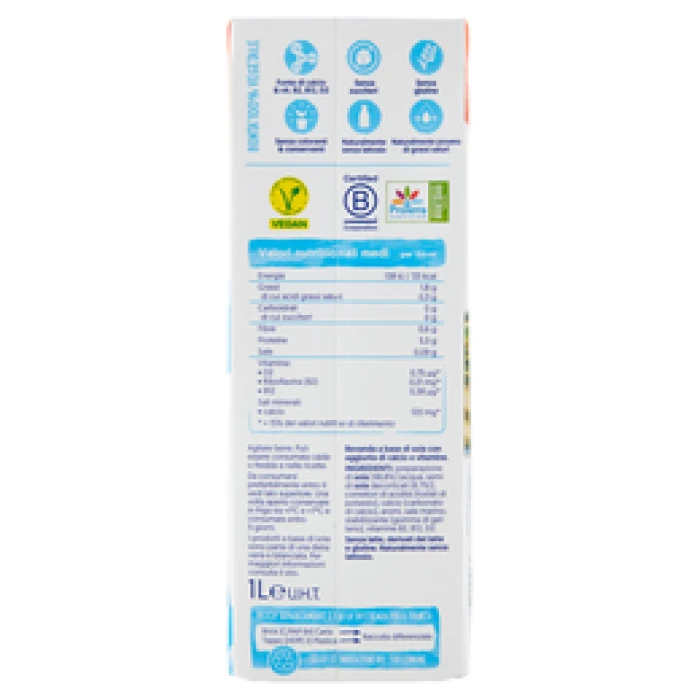 Preparazione di SOIA (98,8%) (acqua, semi di SOIA decorticati (8,7%)), correttori di acidità (fosfati di potassio), calcio (carbonato di calcio), aromi, sale marino, stabilizzante (gomma di gellano), vitamine B2, B12, D2. SENZA LATTE, DERIVATI DEL LATTE E GLUTINE. NATURALMENTE SENZA LATTOSIO
