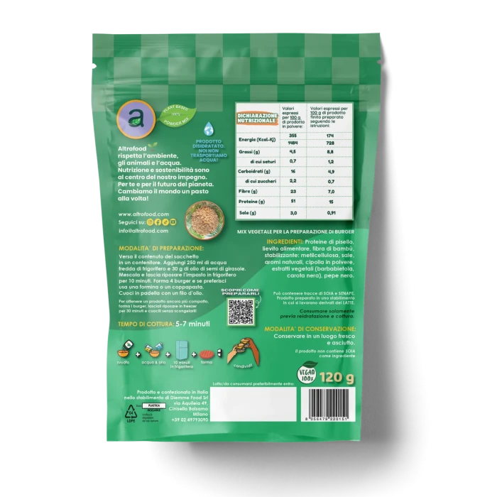 Scopri il gusto unico di ALTRO BURGER MIX: il preparato Plant Based ideale per un burger alternativo al gusto autentico del manzo. L'alternativa alla carne, buona e sostenibile.