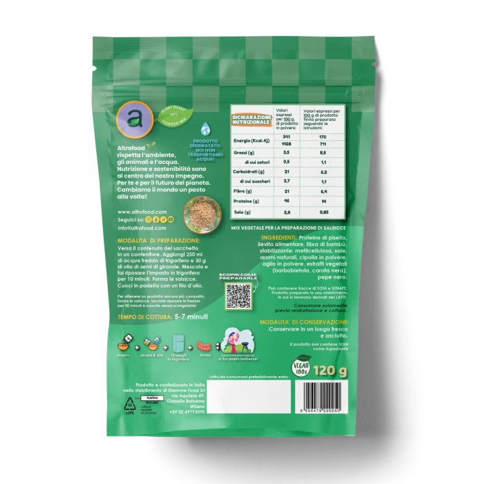 Scopri il gusto autentico di ALTRO SALSICCE MIX, il preparato plant based con proteine di pisello per salsicce vegetali deliziose.