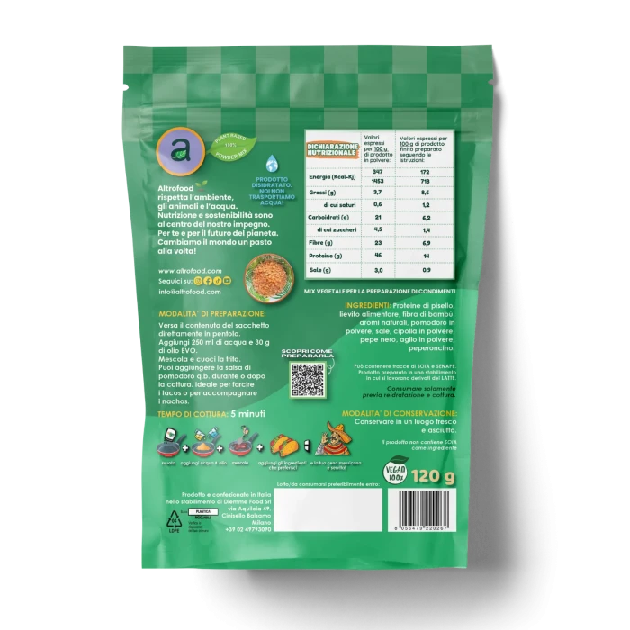 Scopri il sapore avvolgente di ALTRO TACO MIX, il preparato plant based dal gusto spicy per creare taco irresistibili. Semplice e veloce da preparare, regala un tocco piccante e appagante a ogni boccone.