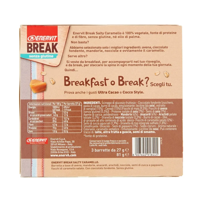 Sciroppo di glucosio-fruttosio, Cioccolato fondente (zucchero, pasta di cacao, burro di cacao, emulsionante: lecitine (da soia), estratto di vaniglia) (15%), Cereali (15%) (fiocchi di mais (9,5%), fiocchi di avena (senza glutine) (5,5%)), Proteine isolate di soia (7%), Semi di soia (7%), Agente di carica: polidestrosio, Mandorle (4%), Anacardi (4%), Arachidi pelate tostate (3,2%), Granella di nocciole tostate (2,5%), Burro di cacao, Olio di girasole ad alto contenuto di acido oleico, Fiocchi di caramello salato (2%), Semi di zucca sgusciati (1,9%), Granella di riso integrale soffiato (1,8%), Umidificante: glicerolo, Semi di papavero (1%), Sodio cloruro, Aroma naturale, Colorante: caramello semplice, Emulsionante: lecitine (da soia), Può contenere tracce di: latte, altra frutta a guscio, semi di sesamo