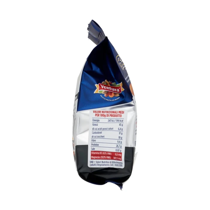 Per 100 g di prodotto - Energia : 2471 kJ / 596 kcal, Grassi : 45 g, di cui acidi grassi saturi : 6,4 g, Carboidrati : 17 g, di cui zuccheri : 10 g, Fibre : 9,4 g, Proteine : 26,7 g, Sale : 0,02 g, Vitamina B3: 6,6 mg, Magnesio : 383,5 mg, VNR = Valori Nutritivi di Riferimento (adulti) Regolamento (UE) 1169/2011: