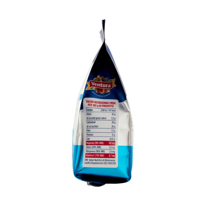 Per 100 g di prodotto - Energia : 2310 kJ / 557 kcal, Grassi : 42 g, di cui acidi grassi saturi : 3,5 g, Carboidrati : 28 g, di cui zuccheri : 20 g, Fibre : 7,3 g, Proteine : 13 g, Sale : 0,02 g, Magnesio : 143 mg, Rame : 1,0 mg, Manganese : 1,9 mg, Vitamina E : 8,7 mg, VNR: Valori Nutritivi di Riferimento (adulti) Regolamento (UE) 1169/2011: