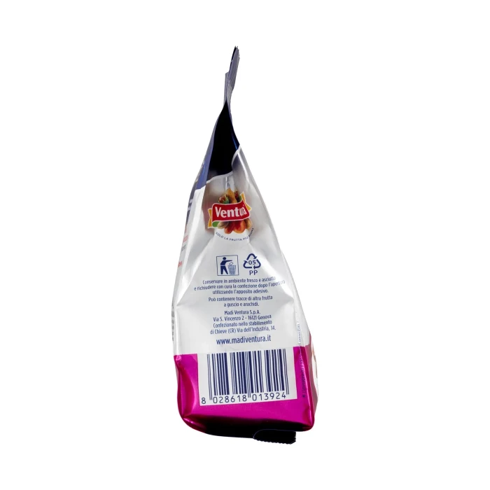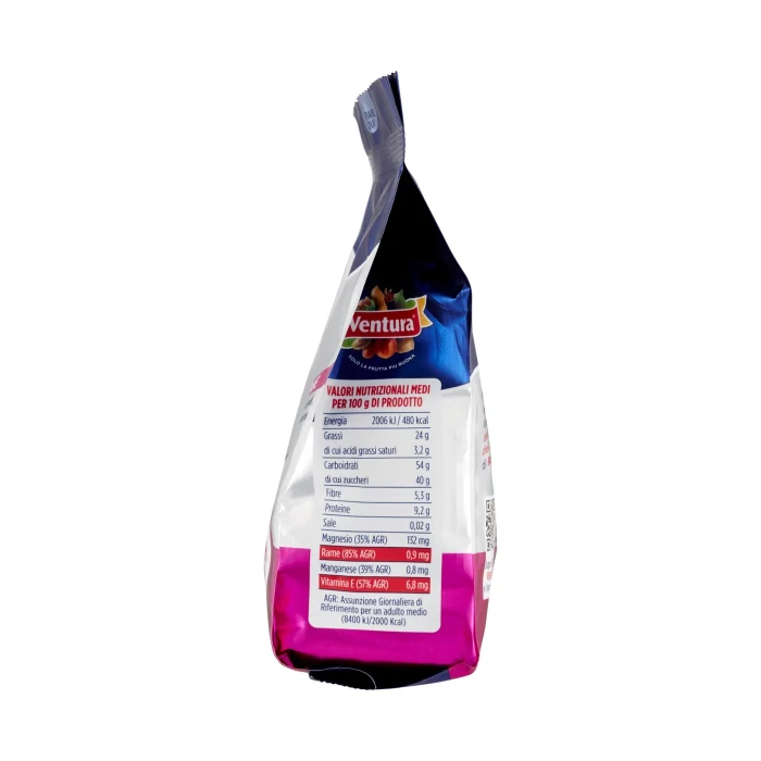 Per 100 g di prodotto - Energia : 2006 kJ / 480 kcal, Grassi : 24 g, di cui acidi grassi saturi : 3,2 g, Carboidrati : 54 g, di cui zuccheri : 40 g, Fibre : 5,3 g, Proteine : 9,2 g, Sale : 0,02 g, Magnesio (35% AGR): 132 mg, Rame (85% AGR): 0,9 mg, Manganese (39% AGR): 0,8 mg, Vitamina E (57% AGR): 6,8 mg, AGR: Assunzione Giornaliera di Riferimento per un adulto medio (8400 kJ/2000 Kcal):