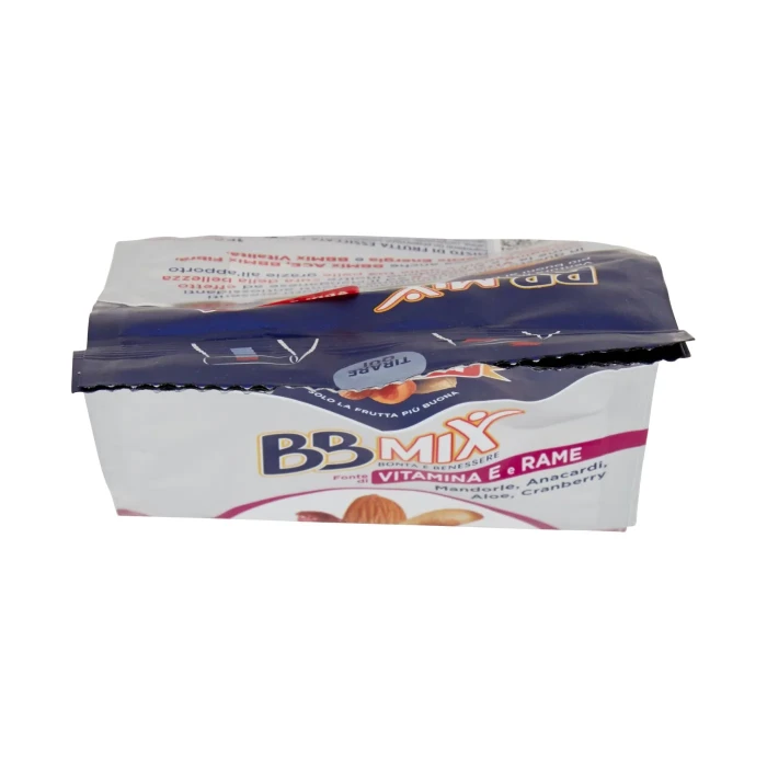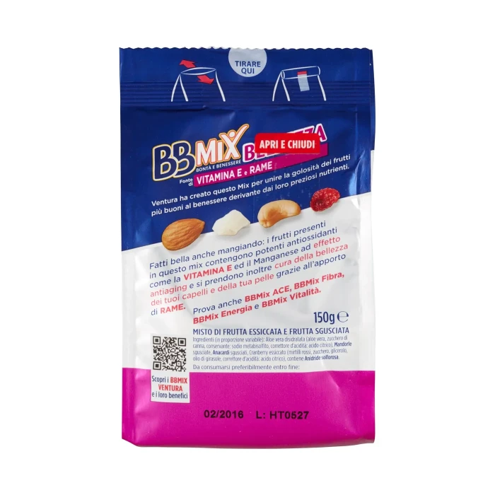 Ingredienti (in proporzione variabile):, Aloe vera disidratata (aloe vera, zucchero di canna, conservante: sodio metabisolfito, correttore di acidità: acido citrico), Mandorle sgusciate, Anacardi sgusciati, Cranberry essiccato (mirtilli rossi, zucchero, glicerolo, olio di girasole, correttore di acidità: acido citrico), Contiene anidride solforosa