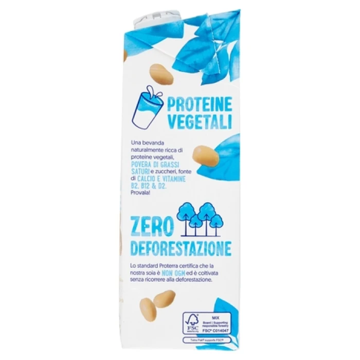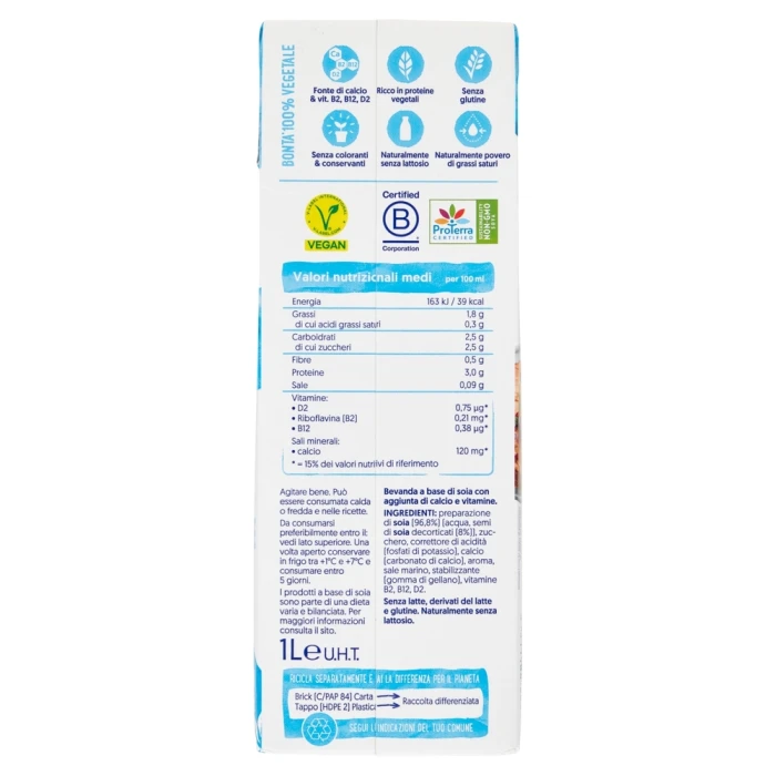 Preparazione di SOIA (96,8%) (acqua, semi di SOIA decorticati (8%)), zucchero, correttore di acidità (fosfati di potassio), calcio (carbonato di calcio), aroma, sale marino, stabilizzante (gomma di gellano), vitamine B2, B12,D2. SENZA LATTE, DERIVATI DEL LATTE E GLUTINE. NATURALMENTE SENZA LATTOSIO