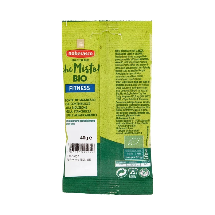 Misto di frutta secca sgusciata in proporzione variabile* (40%) (noci del Brasile*, anacardi*), Mirtilli rossi americani zuccherati (cranberries)* (30%) (mirtilli* 60%, zucchero di canna*, olio di semi di girasole*), Semi di girasole sgusciati* (30%), *da agricoltura biologica, Può contenere arachidi, nocciole, noci, mandorle, pistacchi e soia