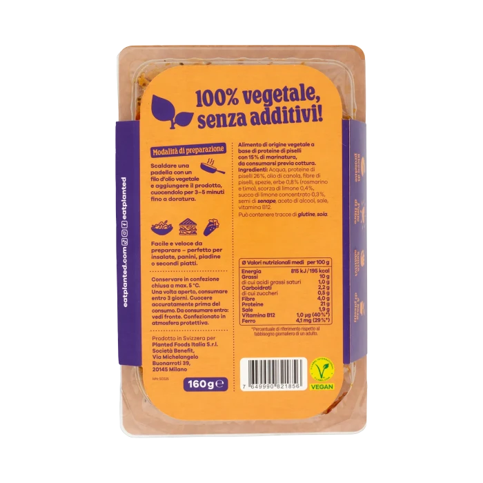 Acqua, Proteine di piselli 26%, Olio di canola, Fibre di piselli, Spezie, Erbe 0,8% (rosmarino e timo), Scorza di limone 0,4%, Succo di limone concentrato 0,3%, Semi di senape, Aceto di alcool, Sale, Vitamina B12.