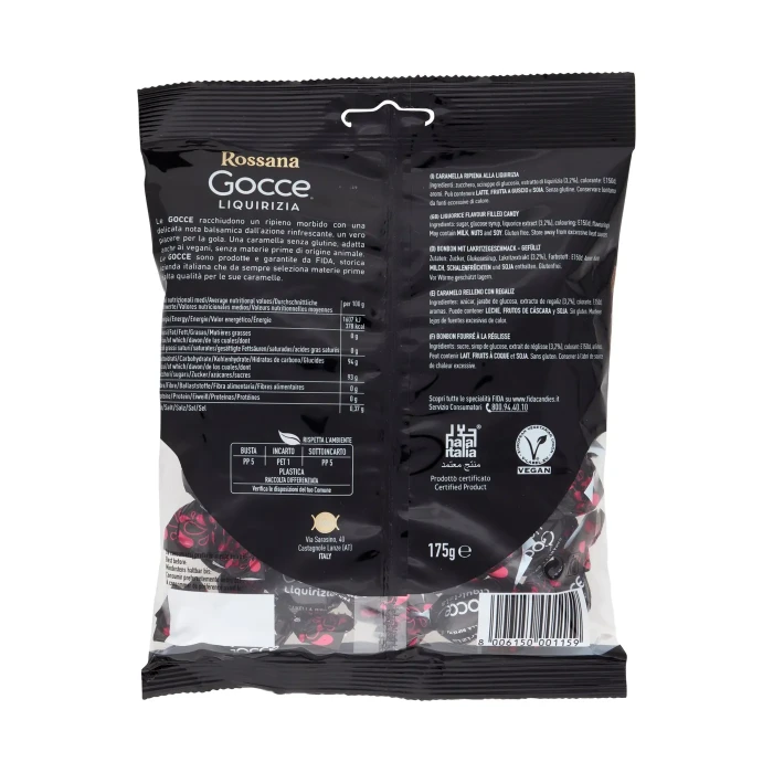 Zucchero, Sciroppo di glucosio, Estratto di liquirizia (3,2%), Colorante: E150d, Aromi, Può contenere latte, frutta a guscio e soia, Senza glutine