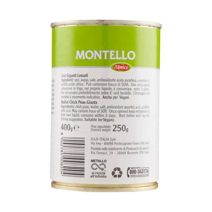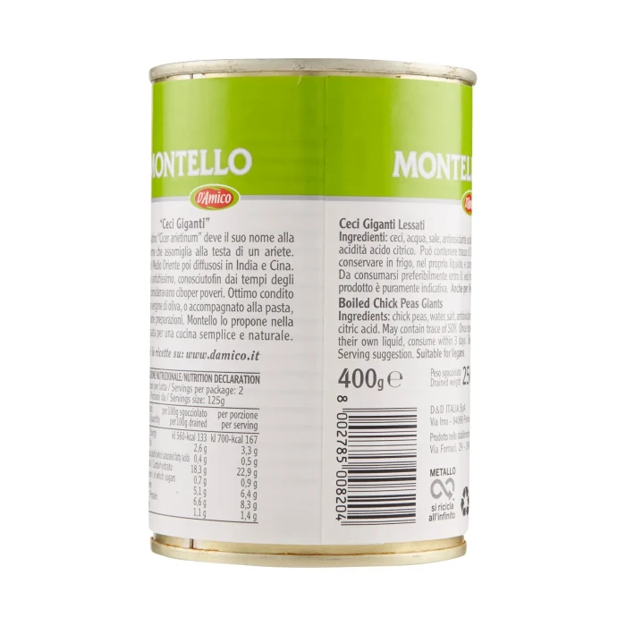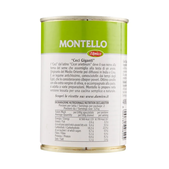 Per 100 g di prodotto - Energia : 560 kJ-133 kcal, Grassi : 2,6 g, di cui acidi grassi saturi : 0,4 g, Carboidrati : 18,3 g, di cui zuccheri : 0,7 g, Fibre : 5,1 g, Proteine : 6,6 g, Sale : 1,1 g, Porzioni per latta: 2 / Porzioni da: 125g: