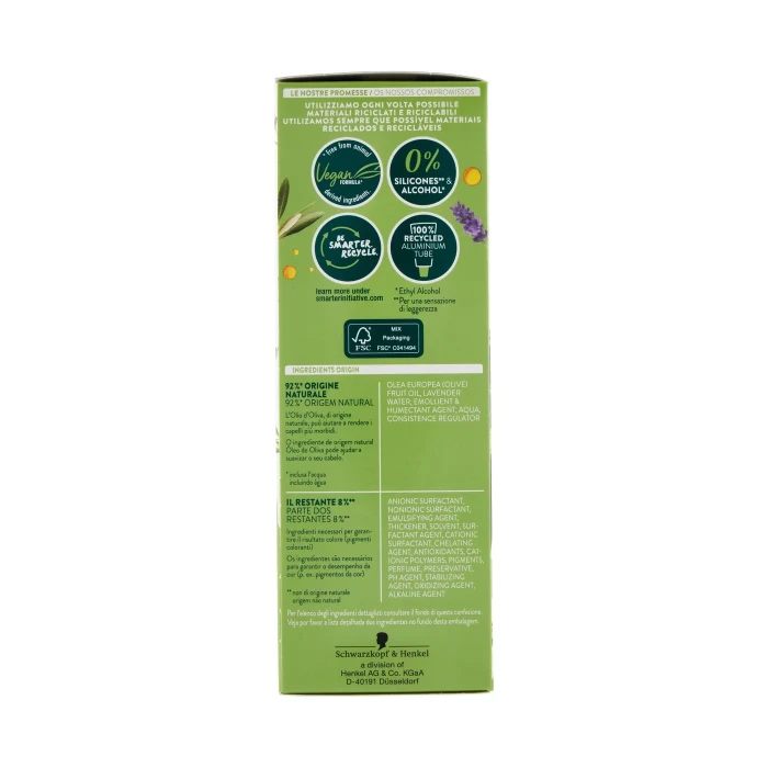 Aqua (Water, Eau), Aqua (Water, Eau), Aqua (Water, Eau), Hydrogen peroxide, Cetearyl alcohol, Cetearyl alcohol, Ammonium hydroxide, Glycerin, Cetearyl alcohol, PEG-40 castor oil, Distearoylethyl Dimonium Chloride, Glyceryl stearate SE, Ceteareth-20, Coco-caprylate, Etidronic acid, Sodium cetearyl sulfate, Sorbitan Caprylate, Octyldodecanol, Guar hydroxypropyltrimonium chloride, Toluene-2,5-diamine sulfate, 2,6-dicarboxypyridine, Disodium pyrophosphate, Sodium laureth sulfate, Olea Europaea (Olive) Fruit oil, Potassium hydroxide, Benzyl alcohol, Potassium hydroxide, Sodium benzoate, Sodium cetearyl sulfate, Betaine, Arachidyl alcohol, Parfum (fragrance), Serine, Parfum (fragrance), Behenyl alcohol, Sodium sulfite, Resorcinol, Arachidyl Glucoside, Dehydroacetic acid, Oleic acid, Glycerin, Limonene, Citric acid, Propylene glycol, Etidronic acid, Linalool, Sodium hydroxide, Carbomer, m-aminophenol, 4-chlororesorcinol, Ascorbic acid, Linoleamidopropyl PG-dimonium chloride phosphate, Sodium sulfate, Benzoic acid, 2-amino-4-hydroxyethylaminoanisole sulfate, Lavandula angustifolia (Lavender) flower extract, Phenoxyethanol, Benzyl alcohol