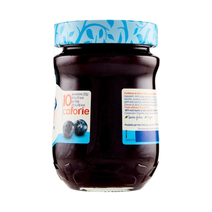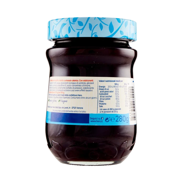 Per 100 g di prodotto - Energia : 200 kJ/48 kcal, Grassi di cui:: 0,2 g, acidi grassi saturi : 0,0 g, Carboidrati : 13,9 g, di cui: zuccheri : 5,3 g, di cui: polioli : 8,6 g, Fibre : 1,3 g, Proteine : 0,3 g, Sale : 0,0 g, Un vaso di 280 g equivale a 14 porzioni da 20 g :