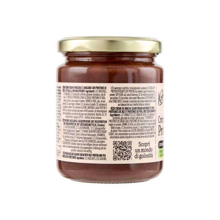 31% NOCCIOLE, 23% ANACARDI, 10% dolcificanti (eritritolo, stevioglicosidi), olio di colza, 7% ESTRATTO DI PROTEINE DI SOIA al cacao (PROTEINE DI SOIA, semola di riso, zucchero, cacao magro in polvere, FARINA DI SOIA, sale, aroma naturale), 6% cacao magro in polvere, 5% proteine di piselli, 5% proteine di riso, datteri in polvere.