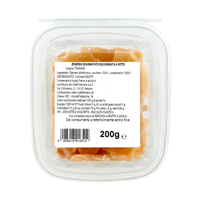 Zenzero disidratato, Zucchero (32%), Conservante: sodio metabisolfito, Contiene solfiti, Può contenere tracce di arachidi e frutta a guscio
