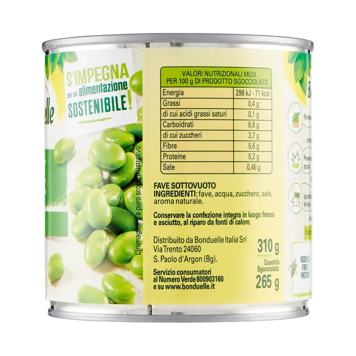 Per 100 g di prodotto - Energia : 298 kJ - 71 kcal, Grassi : 0,4 g, di cui acidi grassi saturi : 0,1 g, Carboidrati : 8,8 g, di cui zuccheri : 3,7 g, Fibre : 5,6 g, Proteine : 5,2 g, Sale : 0,46 g