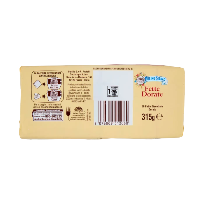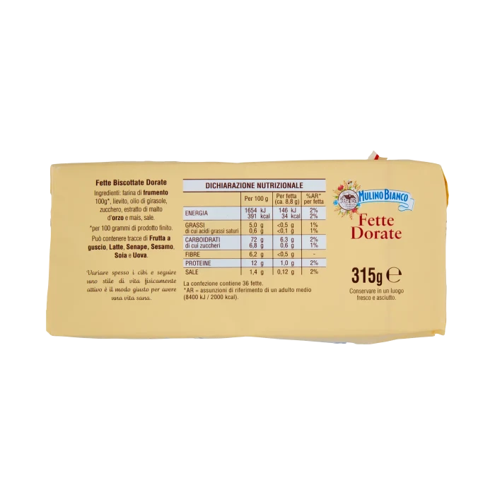 Per 100 g di prodotto - Energia: 1654 kJ, : 391 kcal, Grassi: 5,0 g, di cui acidi grassi saturi: 0,6 g, Carboidrati: 72 g, di cui zuccheri: 6,8 g, Fibre: 6,2 g, Proteine: 12 g, Sale: 1,4 g, La confezione contiene 36 fette: , *AR = Assunzioni di riferimento di un adulto medio (8400 kJ / 2000 kcal):
