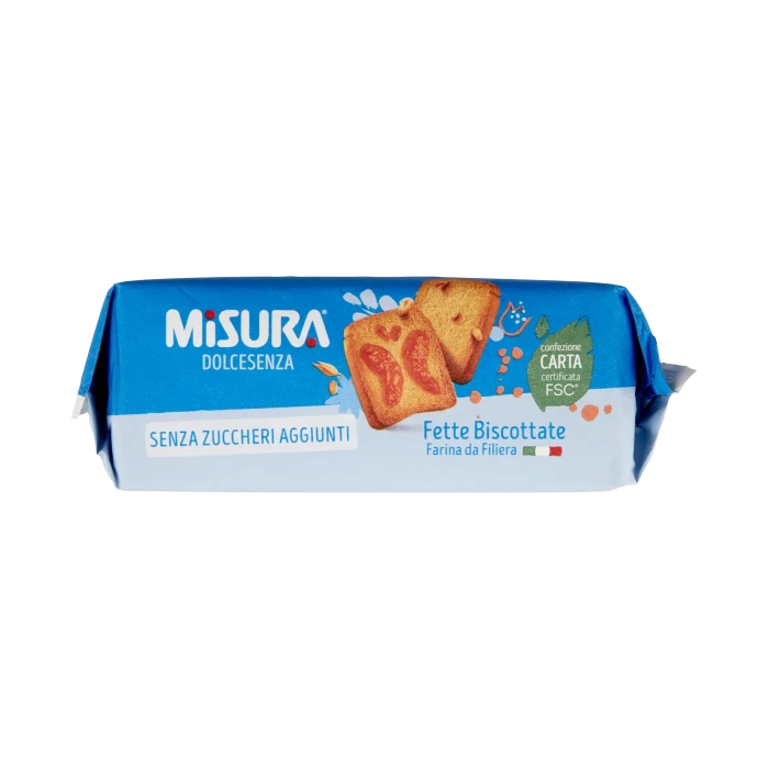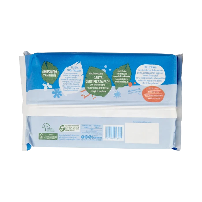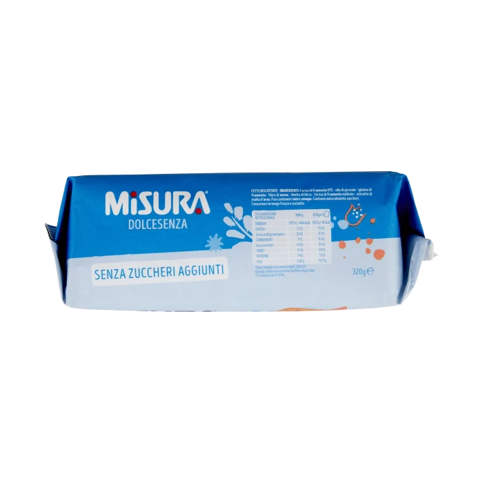 Per 100 g di prodotto - Energia: 1707 kJ / 404 kcal, Grassi: 5,1 g, di cui acidi grassi saturi: 0,6 g, Carboidrati: 71 g, di cui zuccheri: 4,0 g, Fibre*: 9,1 g, Proteine: 14 g, Sale: 0,02 g, *Determinate con metodo AOAC 2009.01: , Questa confezione contiene 36 fette biscottate: , 3 Confezioni da 12 fette: