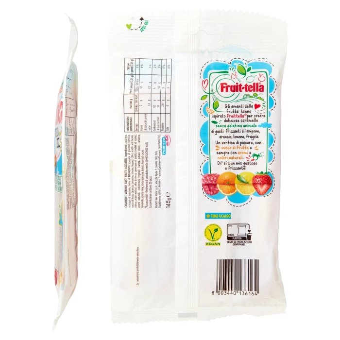 Gli amanti della frutta hanno ispirato Fruittella per creare deliziose caramelle senza gelatina animale ai gusti frizzanti di lampone, arancia, limone, fragola. Un vortice di piacere, con succo di frutta e sempre con aromi e colori naturali.