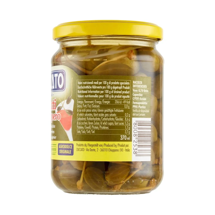 Frutti di cappero, Acqua, Aceto di vino, Sale, Antiossidanti: Ac.Citrico, Ac. L-Ascorbico, Anidride Solforosa.