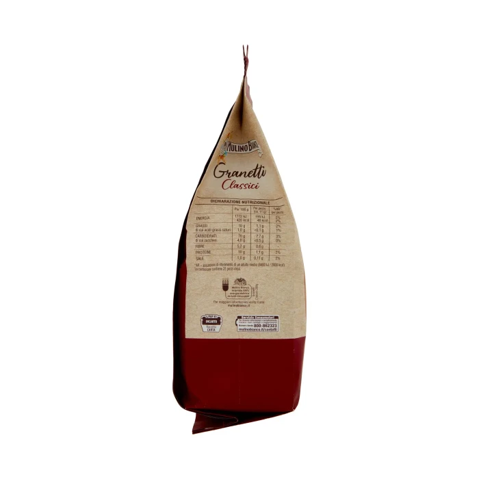 Per 100 g di prodotto - Energia : 1772 kJ, : 420 kcal, Grassi : 10 g, di cui acidi grassi saturi : 1,0 g, Carboidrati : 70 g, di cui zuccheri : 4,0 g, Fibre : 5,2 g, Proteine : 10 g, Sale : 1,0 g, *AR = assunzioni di riferimento di un adulto medio (8400 kJ / 2000 kcal): , La confezione contiene 25 pezzi circa: