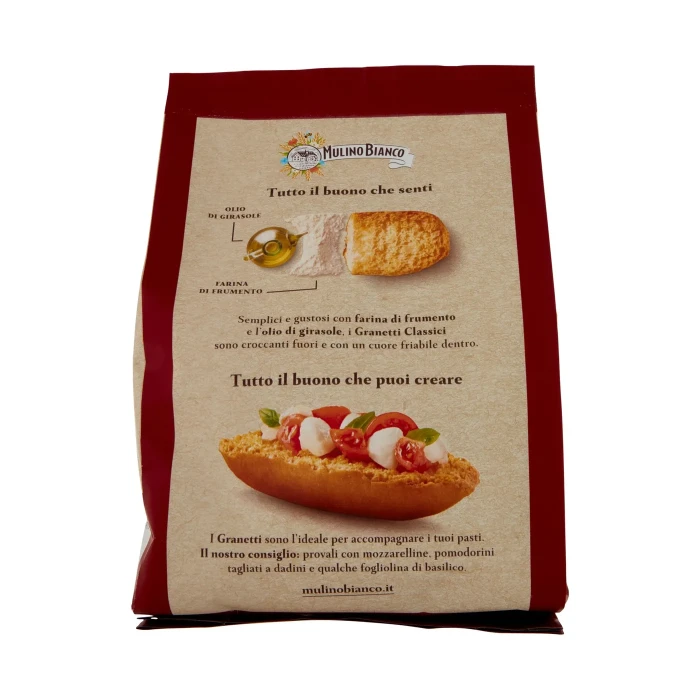 Farina di frumento 98g*, Olio di girasole 8,5g*, Lievito, Zucchero, Sale, Farina di frumento maltato, *per 100 grammi di prodotto finito, Può contenere tracce di frutta a guscio, latte, senape, soia e uova