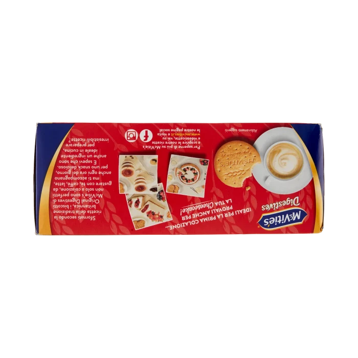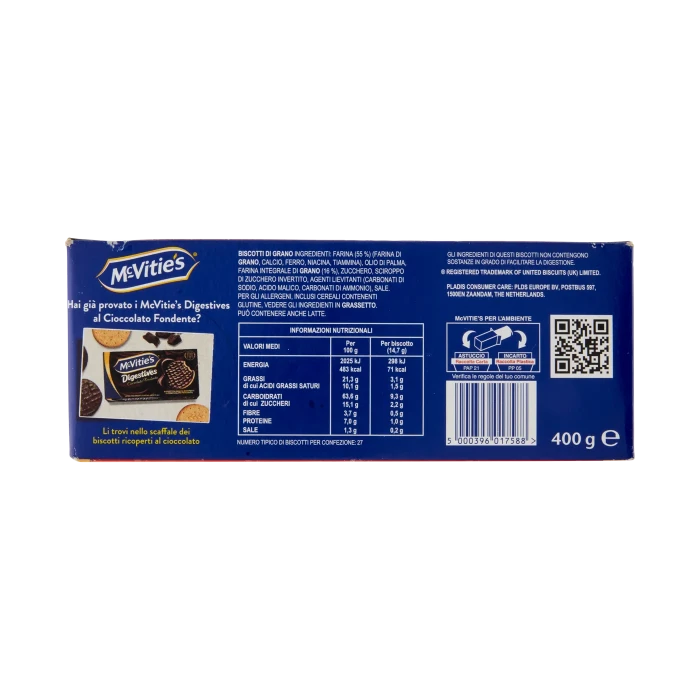 Per 100 g di prodotto - Energia : 2025 kJ, : 483 kcal, Grassi : 21,3 g, di cui Acidi grassi saturi : 10,1 g, Carboidrati : 63,6 g, di cui Zuccheri : 15,1 g, Fibre : 3,7 g, Proteine : 7,0 g, Sale : 1,3 g, Numero tipico di biscotti per confezione: 27 :