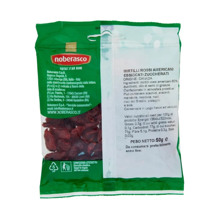 Mirtilli rossi americani 60%, Zucchero, Olio di semi di girasole, Può contenere arachidi, anacardi, mandorle, nocciole, noci, noci del Brasile, pistacchi e soia