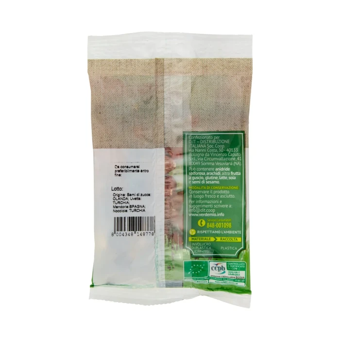 Semi di zucca* 25%, Uvetta* 25% (uva essiccata*, olio di semi di cotone*), Mandorle* sgusciate 25%, Nocciole* sgusciate 25%, *Ingredienti biologici, Può contenere anidride solforosa, arachidi, altra frutta a guscio, glutine, latte, soia e semi di sesamo