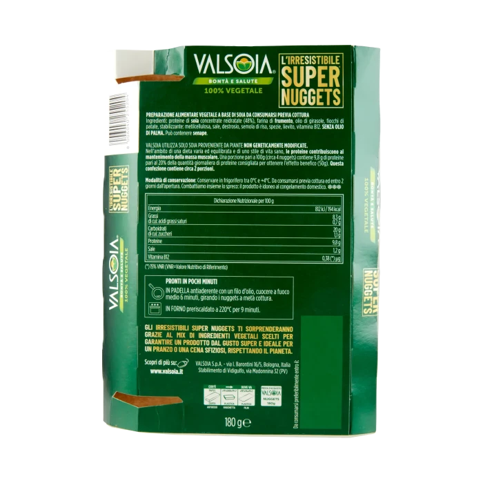 Per 100 g di prodotto - Energia : 812 kJ / 194 kcal, Grassi : 8,3 g, di cui: acidi grassi saturi : 0,7 g, Carboidrati : 20 g, di cui: zuccheri : 1,1 g, Proteine : 9,8 g, Sale : 1,2 g, Vitamina B12 : 0,38 (*) µg, (*) 15% VNR (VNR=Valore Nutritivo di Riferimento) :