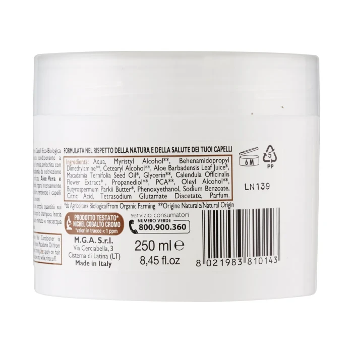 Aqua, Myristyl Alcohol**, Behenamidopropyl Dimethylamine**, Cetearyl alcohol**, Aloe Barbadensis Leaf Juice*, Macadamia Ternifolia Seed Oil*, Glycerin**, Calendula Officinalis Flower Extract*, Propanediol**, PCA**, Oleyl Alcohol**, Butyrospermum parkii butter*, Phenoxyethanol, Sodium benzoate, Citric acid, Tetrasodium glutamate diacetate, Parfum, *da agricoltura biologica, **Origine Naturale