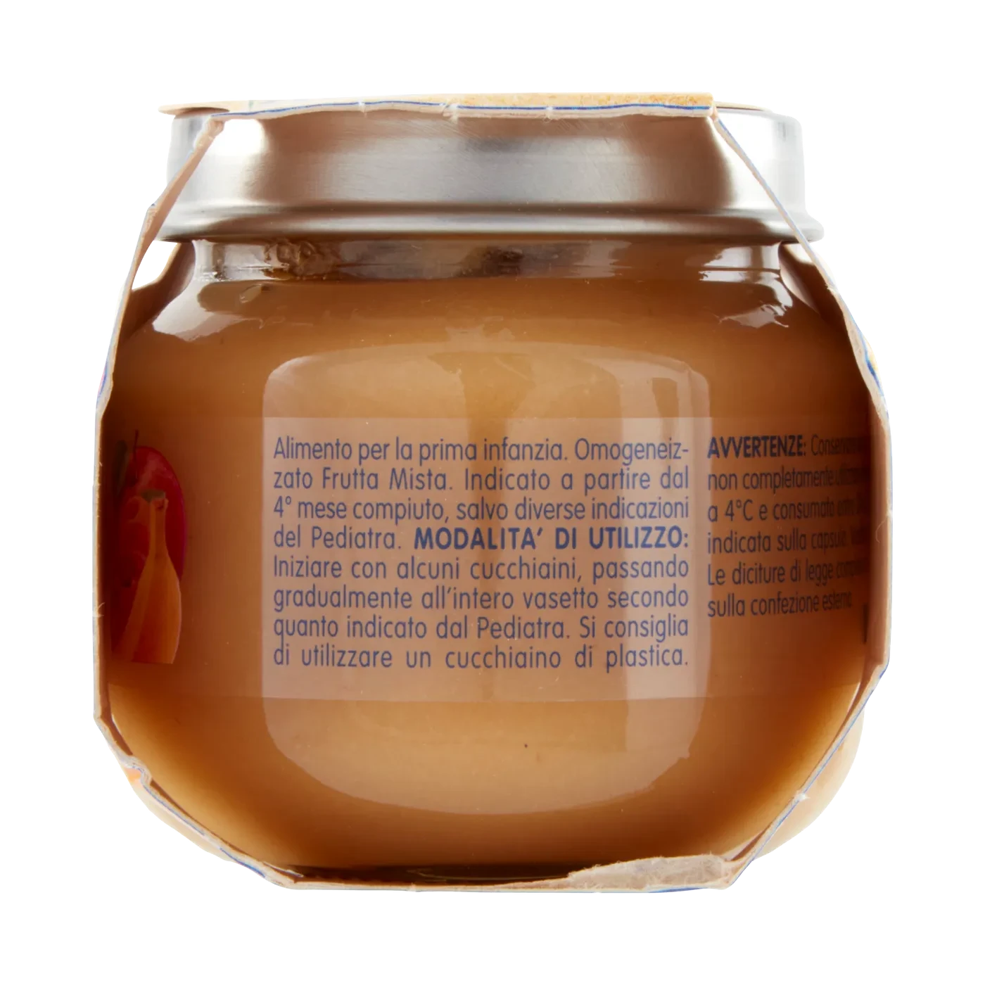 Purea di frutta mista (mela, banana, pesca e albicocca) (91%), Acqua, Farina di riso, Vitamina C, Senza glutine