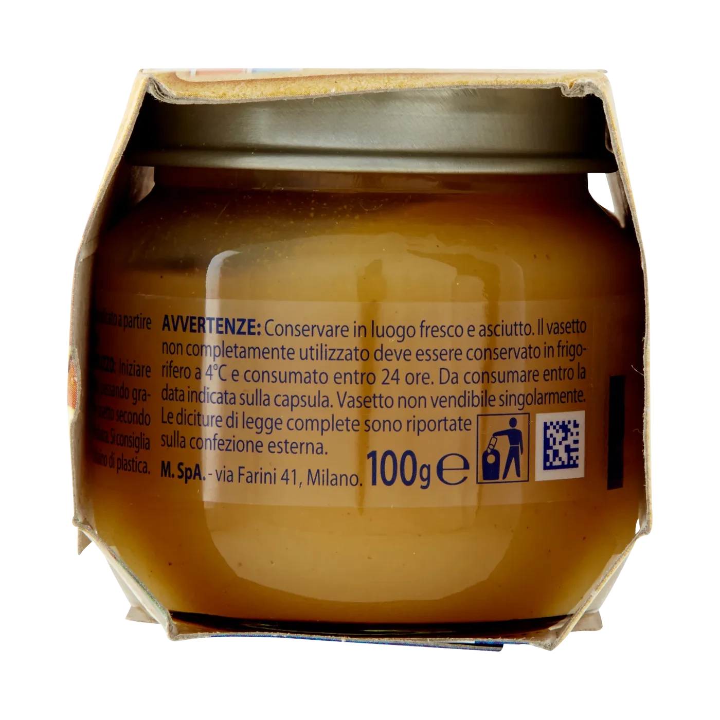 Purea di pera (90%), Acqua, Amido di mais, Vitamina C