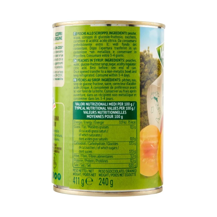 Per 100 g di prodotto - Energia : 319 kJ 75 kcal, Grassi : 0,1 g, di cui acidi grassi saturi : 0,0 g, Carboidrati : 17,5 g, di cui zuccheri : 17,5 g, Fibre : 1,1 g, Proteine : 0,5 g, Sale : 0,01 g