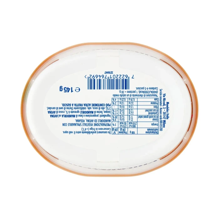 Preparazione a base di mandorla ed avena (acqua, farina di mandorle sgrassate 6 %, crusca di avena 3 %), Olio di cocco, Sale, Stabilizzante (farina di semi di carrube), Può contenere altra frutta a guscio