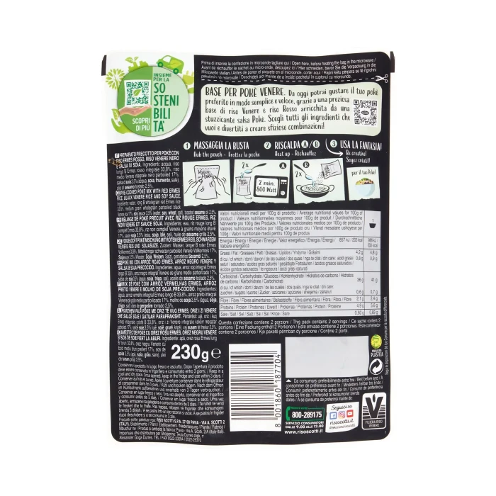 Acqua, Riso lungo B Ermes rosso integrale 33,8%, Riso medio Venere integrale nero parboiled 17%, Salsa di soia 3,5% (acqua, soia, frumento, sale), Olio di sesamo tostato 2,5%