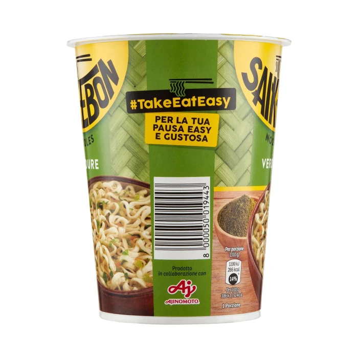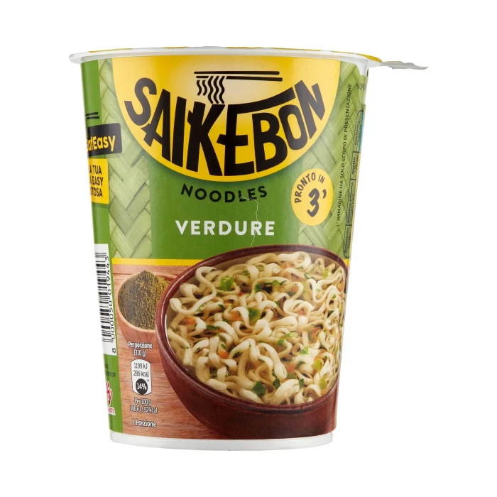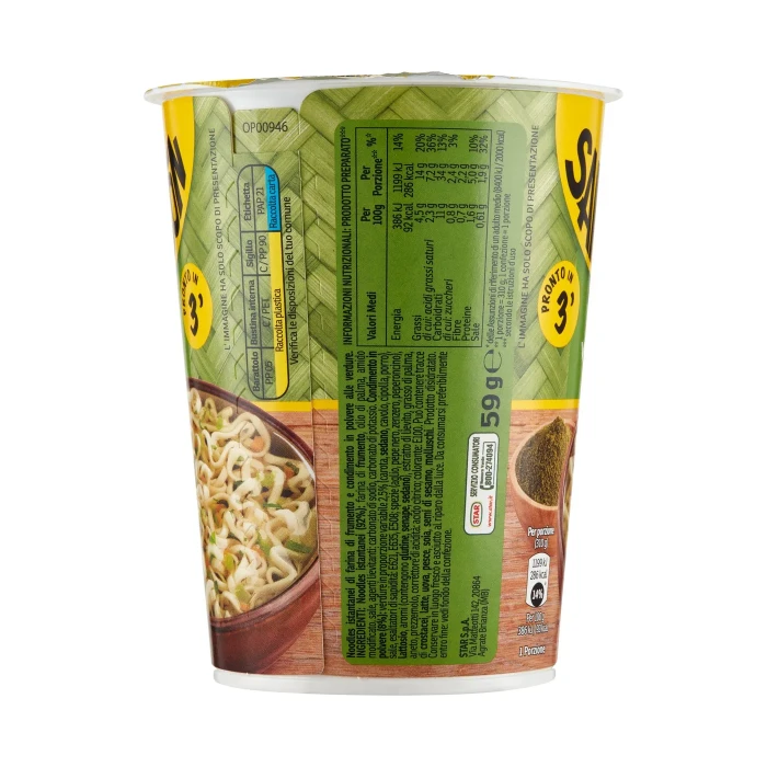 Noodles istantanei (92%): farina di frumento, olio di palma, amido modificato, sale, agenti lievitanti: carbonato di sodio, carbonato di potassio, Condimento in polvere (8%): verdure in proporzione variabile 2,5% (carota, sedano, cavolo, cipolla, porro), sale, esaltatori di sapidità: E621, E635, E508, spezie (aglio, pepe nero, zenzero, peperoncino), lattosio, aromi (contengono glutine, senape, sedano), estratto di lievito, grasso di palma, aneto, prezzemolo, correttore di acidità: acido citrico, colorante: E100, Può contenere tracce di crostacei, latte, uova, pesce, soia, semi di sesamo, molluschi