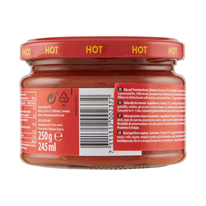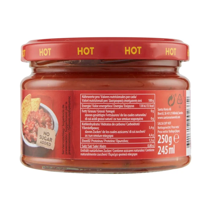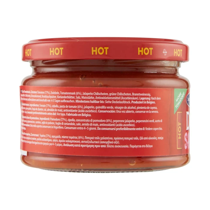 Pomodoro (77%), Cipolla, Concentrato di pomodoro (6%), Peperone jalapeño, Peperoncini verdi, Aceto di alcol, Pepe di Cayenna, Peperoncino, Cumino, Aglio in polvere, Foglie di coriandolo, Sale, Amido di mais, Antiossidanti (acido ascorbico)