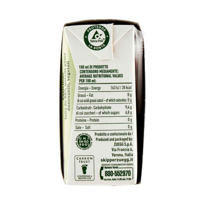 Per 100 g di prodotto - Energia : 163 kJ/ 38 kcal, Grassi : 0 g, di cui acidi grassi saturi : 0 g, Carboidrati : 9,4 g, di cui zuccheri : 6,8 g, Proteine : 0 g, Sale : 0 g