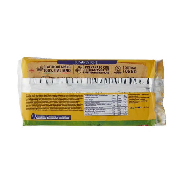 Farina di frumento 83 %, Olio di girasole 14 %, Zucchero, Agenti lievitanti (carbonati di ammonio, fosfati di calcio, carbonati di sodio), Olio extravergine di oliva 3 %, Sale, Sciroppo di glucosio-fruttosio, Farina di orzo maltato, Miscela di erbe aromatiche 0,2 %, Origano 0,1 % , Rosmarino 0,1 %, Spinaci, Basilico 0,1 %, Può contenere uova e latte