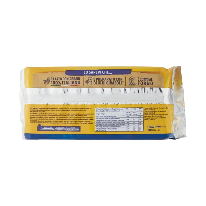Per 100 g di prodotto - Energia : 1892 kJ, : 451 kcal, Grassi : 18 g, di cui acidi grassi saturi : 1,6 g, Carboidrati : 63 g, di cui zuccheri : 8,9 g, Fibre : 3,4 g, Proteine : 8,1 g, Sale : 1,6 g, * Assunzioni di riferimento di un adulto medio (8400 kJ / 2000 kcal) : , 1 Pacco = 8 confezioni (31,3 g): , 1 Confezione (31,3 g) ≃ 5 crackers:
