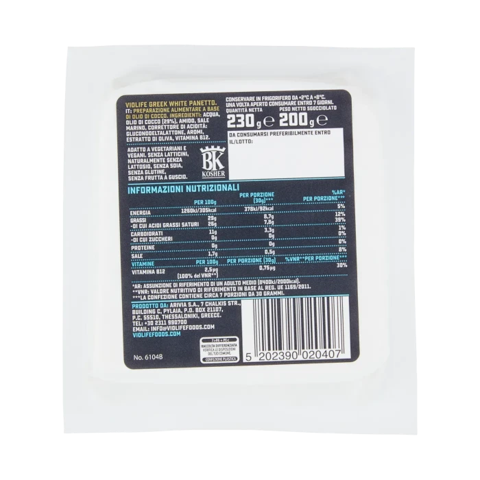 Per 100 g di prodotto - Energia : 1260kJ/305kcal, Grassi : 29g, - di cui acidi grassi saturi : 26g, Carboidrati : 11g, - di cui zuccheri: 0g, Proteine : 0g, Sale : 1,7g, Vitamine: , Vitamina B12 : 2,5µg, *AR: Assunzione di riferimento di un adulto medio (8400kJ/2000kcal) : , **VNR: Valore nutritivo di riferimento in base al Reg. UE 1169/2011: , ***La confezione contiene circa 7 porzioni da 30 grammi: