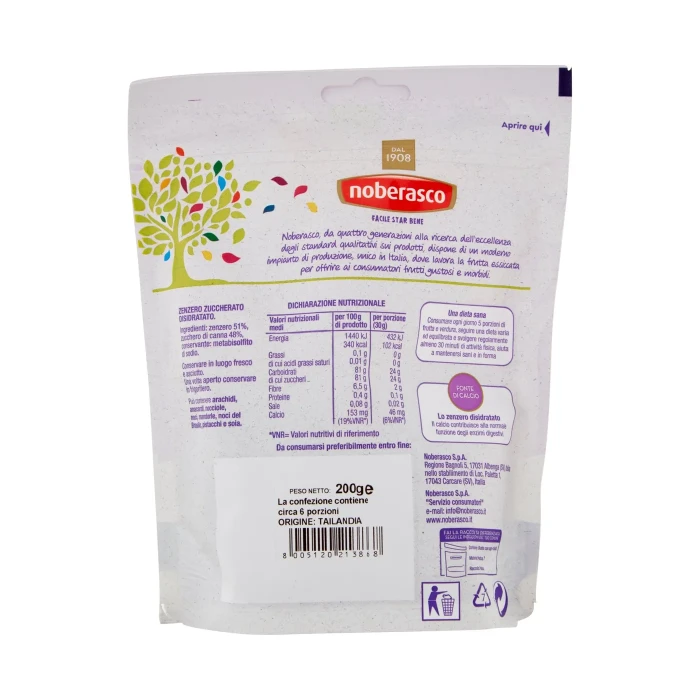 Zenzero 51%, Zucchero di canna 48%, Conservante: metabisolfito di sodio, Può contenere arachidi, anacardi, nocciole, noci, mandorle, noci del Brasile, pistacchi e soia